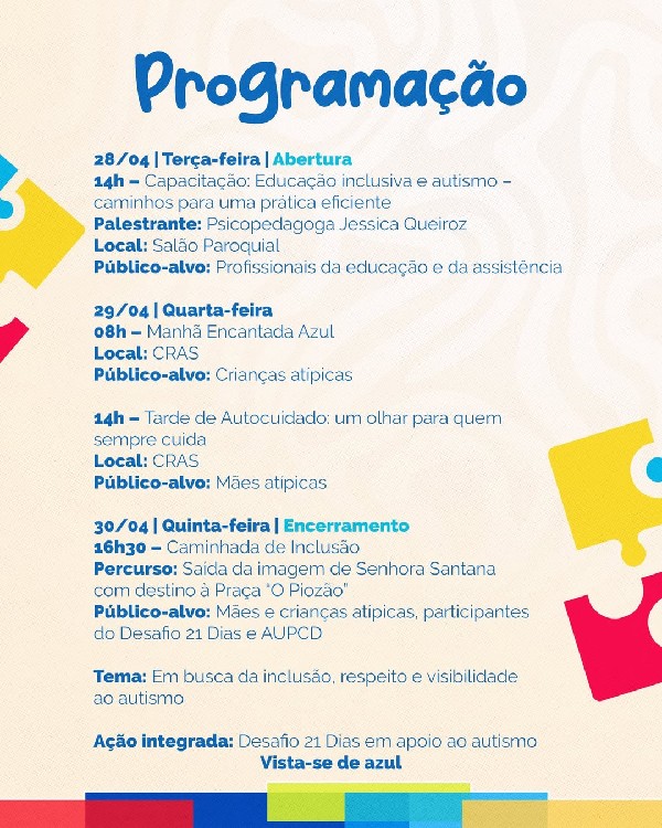 Serão dias de ações pensadas para promover inclusão, fortalecer vínculos e ampliar o olhar da sociedade sobre o autismo.